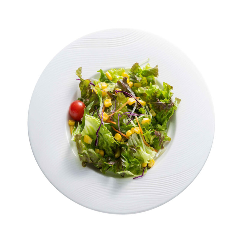 レタス、サニーレタス、水菜、プチトマト、青じそドレッシング、とうもろこし、人参、紫キャベツ